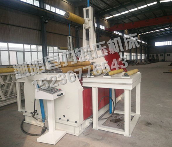 該四輥卷板機與對稱三輥卷板機比較,它可以不借助其它設備模具,直接予彎板材端部,而且剩余直邊較??;它可以不使板材調(diào)頭,而卷成工件。